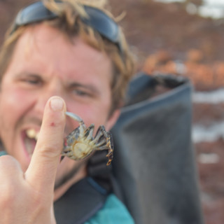 It wasn’t at first day break, but it was morning when everyone emerged ready to explore. Our trusty Zodiac had recently been given the fitting name of “Zazu” who was ready for her moment to shine. We lowered her and she got filled with bodies eager to set foot on land. The kayak and surf board were also launched. The fleet paddled vigorously towards the breaking waves against the shore. As we approached it was clear this landing was going to take some skill. Skill which I certainly did not have as I got broad sided and tipped out of the kayak, I clambered to my feet, covered in sand and soaking wet. Sand beneath everyone’s feet was a welcome sensation. Soon everyone was busy draping boa kelp across their shoulders, digging in the sand, and gaping at strange succulents that hung in ribbons against rock faces.